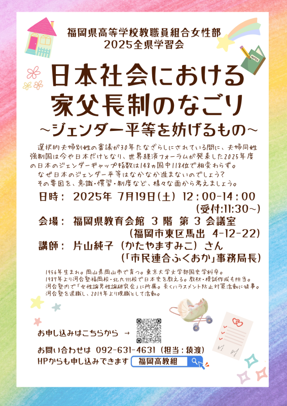 女性部は7月19日(土)12:00~14:00、県教育会館にて学習会を開催します。今回は片山純子さんを迎え「日本社会における家父長制のなごり~ジェンダー平等を妨げるもの~」をテーマに講演会を開催します。