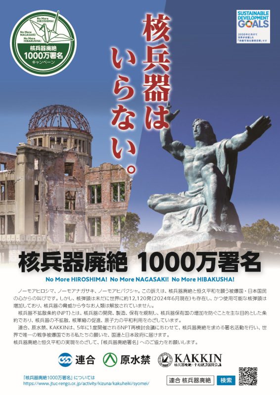 連合は、2026年NPT再検討会議にむけて、核兵器廃絶にむけた内外の世論を高めるため、核兵器廃絶と世界の恒久平和の実現をめざし、原水禁、核兵器廃絶・平和建設国民会議(KAKKIN)と連携したとりくみを展開することとしました。